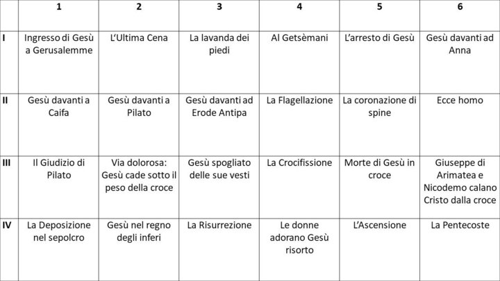 Poiché purtroppo non è possibile ammirare l'originale, in tempi di emergenza pandemica a causa della chiusura dei musei, offriamo la possibilità di scaricare una foto con visione completa della tela quaresimale e una tabella con brevi indicazioni delle immagini.