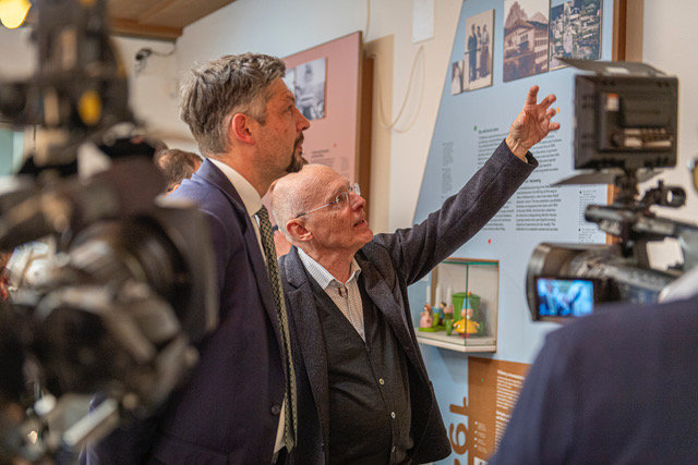 Inaugurazion dla mostra nueva di juesc dla Sevi, 4.12.2025. Da man drëta a man ciancia: diretëures dla Repartizion innuvazion, nrescida, università y museums Franz Schöpf y Manuel Gatto, diretëur dla Repartizion cultura ladina Mathias Stuflesser cun assessëur Daniel Alfreider, diretëura dl museum Paulina Moroder y presidënt Georg Senoner, ambolc de Urtijei y Santa Cristina Tobia Moroder y Christoph Senoner