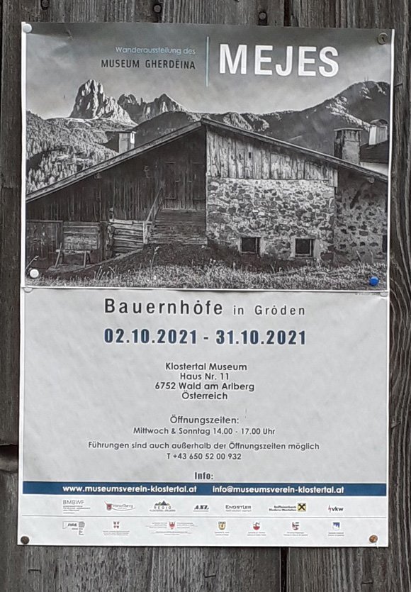 La mostra itineranta dl Museum Gherdëina dal titul: „Mejes - la memoria de na cuntreda“ fova bele njinieda dal 2019. Per l Museum dl Arlberg ie chësta mostra n cumplemënt a si pruiet “Historische ArchitekTouren“, pra chël che ëi se à dat ju cun la tueda y documentazion dl’architetura de si cuntreda. “La mostra sun i mejes tl Klostertal Museum dà la puscibltà de udëi sëura i cunfins ora”, dij l presidënt dla lia dl Museum, Christof Thöny.
