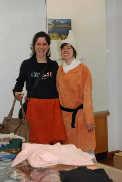Thea Unteregger (pedagogia museala) y Eveline Vinatzer (Departimënt inovazion y cunsulënza) presënta daldò te n workshop i materiai nueves per la scola ntëur al guat y al furnimënt tl’età dl fier. L vën stlarì la funzion dla fibules de Col de Flam cunservedes tl Museum.