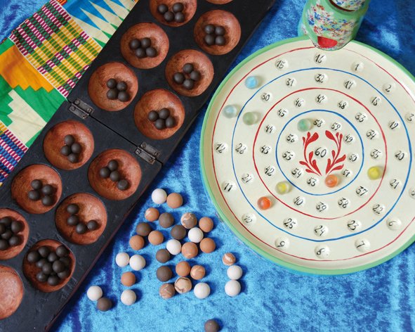 l juech de strategia „Kalaha“ dla familia di juesc Mancala cun ravises africanes. Pensà per l’età dai 10 ani insù.